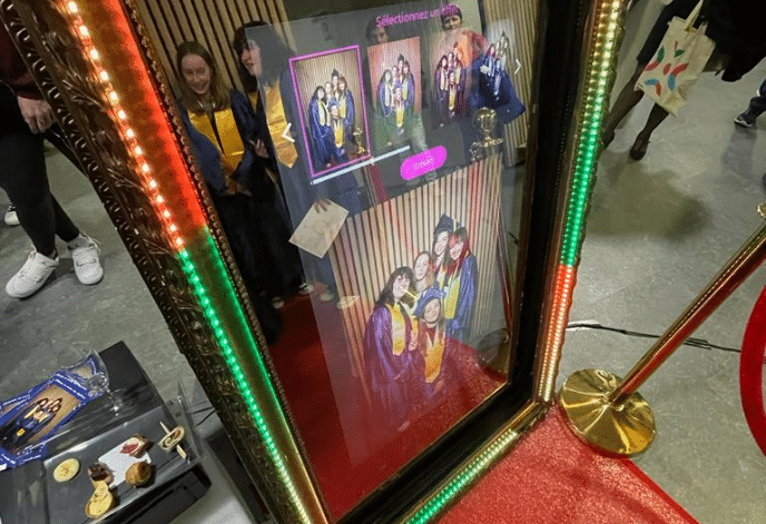 Notre solution le photobooth Miroir. Unique en son genre ce photobooth associe fun et design impressionnant. Grâce à sa prise de vue de plain pied ce photobooth est parfait pour les photos de groupe que ça soit entre camarades, entre amis ou avec les familles. Le petit plus l’impression haute qualité pour un souvenir de ce grand moment que les élèves garderont à vie !