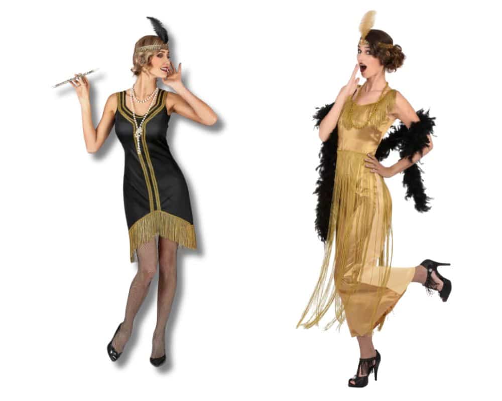 - Robes à franges – Les fameuses robes Charleston, ornées de franges qui bougent au rythme de la danse, sont indispensables pour ce thème. Disponibles en noir, doré ou argenté, elles offrent une allure élégante et festive.
