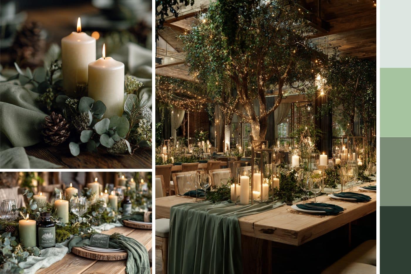 - ➡️ Déco mariage féerique verte : sapin/eucalyptus, bois clair, bougies crème, rubans velours vert profond.
