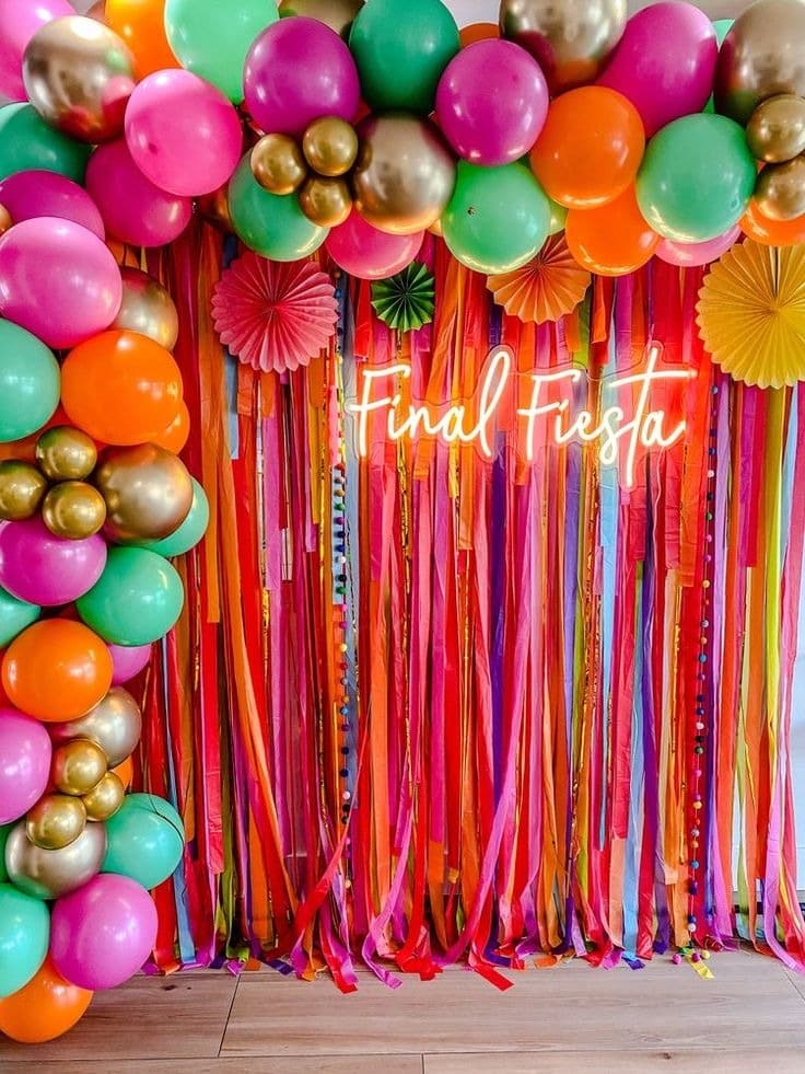 - Photocall avec rideau de confettis ou Mur de rubans en cascade : Les confettis ou les rubans créent un effet visuel élégant et festif, ajoutant de la joie et de l’éclat aux clichés. Pour le fabriquer, vous pouvez découper ou acheter des confettis en papier de différentes couleurs et les attacher à une ficelle ou à un fil. Vous pouvez également trouver des rideaux de confettis prêts à l’emploi dans les magasins de décoration de mariage